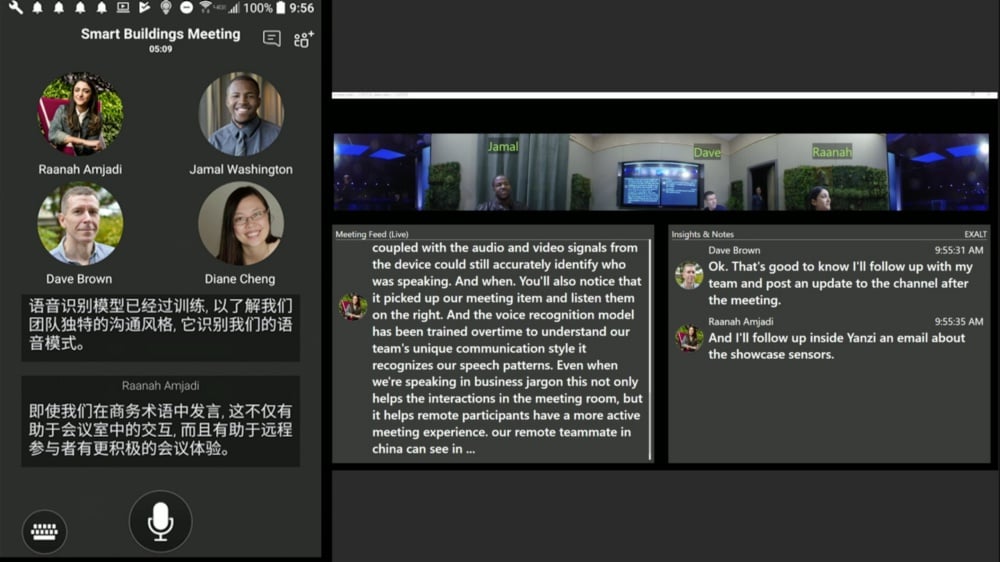 而在進一步的應用裡,微軟更可藉由Microsoft 365平台整合人工智慧技術應用,讓會議室系統能自動辨識、標示加入參與會議的成員身分,並且在會議過程中透過語音識別快速記錄會議內容,或是透過即時翻譯讓不同語言使用者也能無障礙參與會議討論。