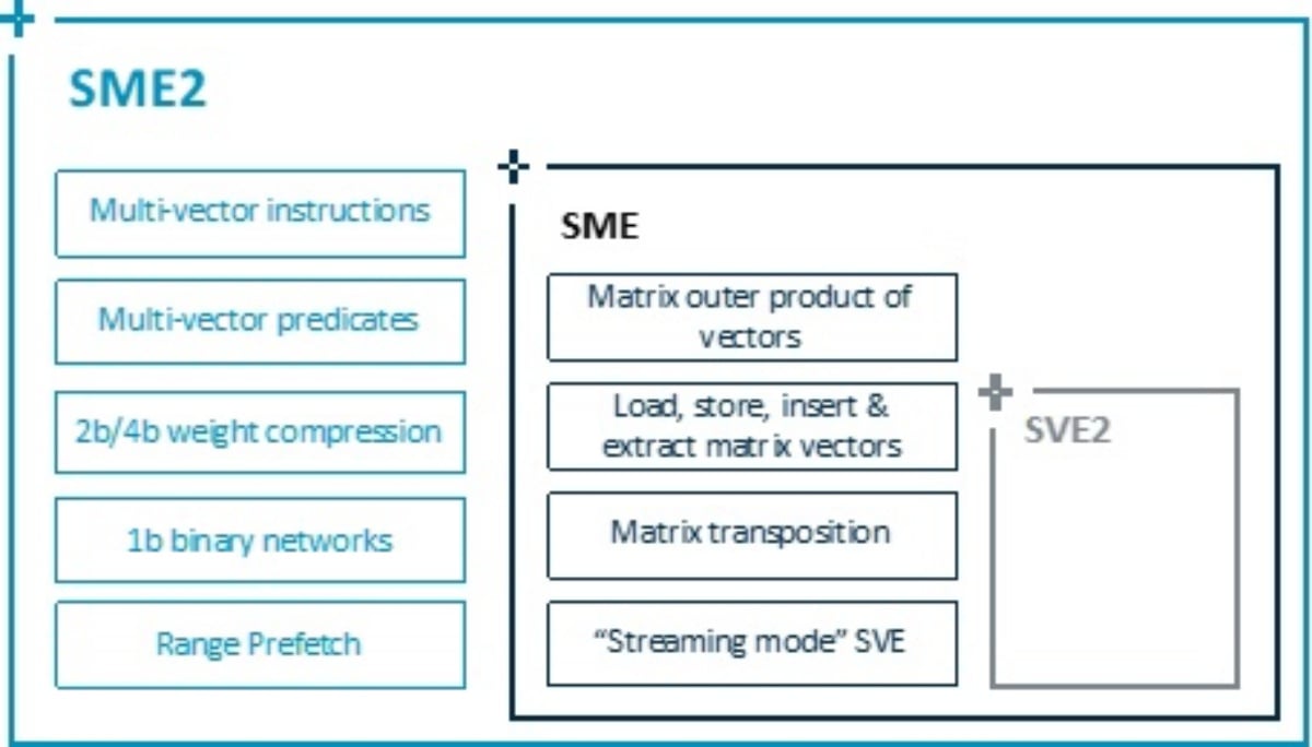 SME2為Armv9指令集架構中的高效能CPU指令集升級,專為加速電腦視覺、語音辨識、自然語言處理等AI工作負載處理效率所設計,可直接運行於行動裝置CPU上,無需額外仰賴雲端運算資源,即可改善裝置端AI應用延遲與能耗的瓶頸。