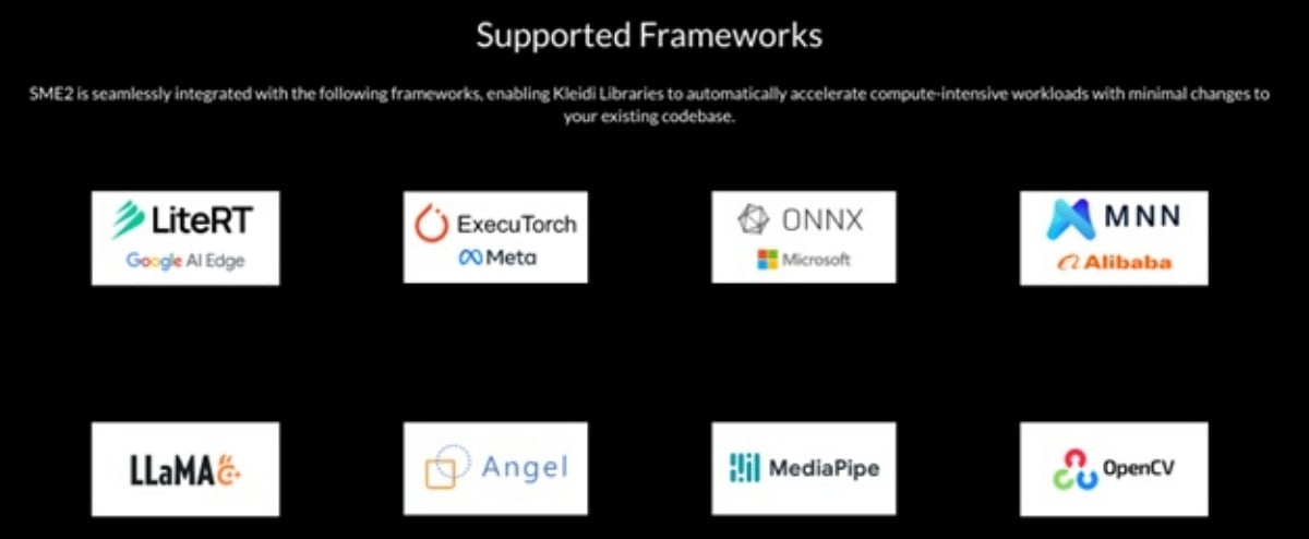 更重要的是,透過Arm旗下的KleidiAI軟體加速層,開發者無需修改模型或應用程式,即可自動藉由SME2提高的執行效能。目前,SME2已經整合進多個主流AI框架與函式庫,包括Google的XNNPACK、LiteRT、MediaPipe,或是阿里巴巴的MNN、Microsoft ONNX Runtime,甚至到llama.cpp,意味SME2已經全面融入現有Android AI軟體堆疊,確保開發者能在現有架構中即時受惠。