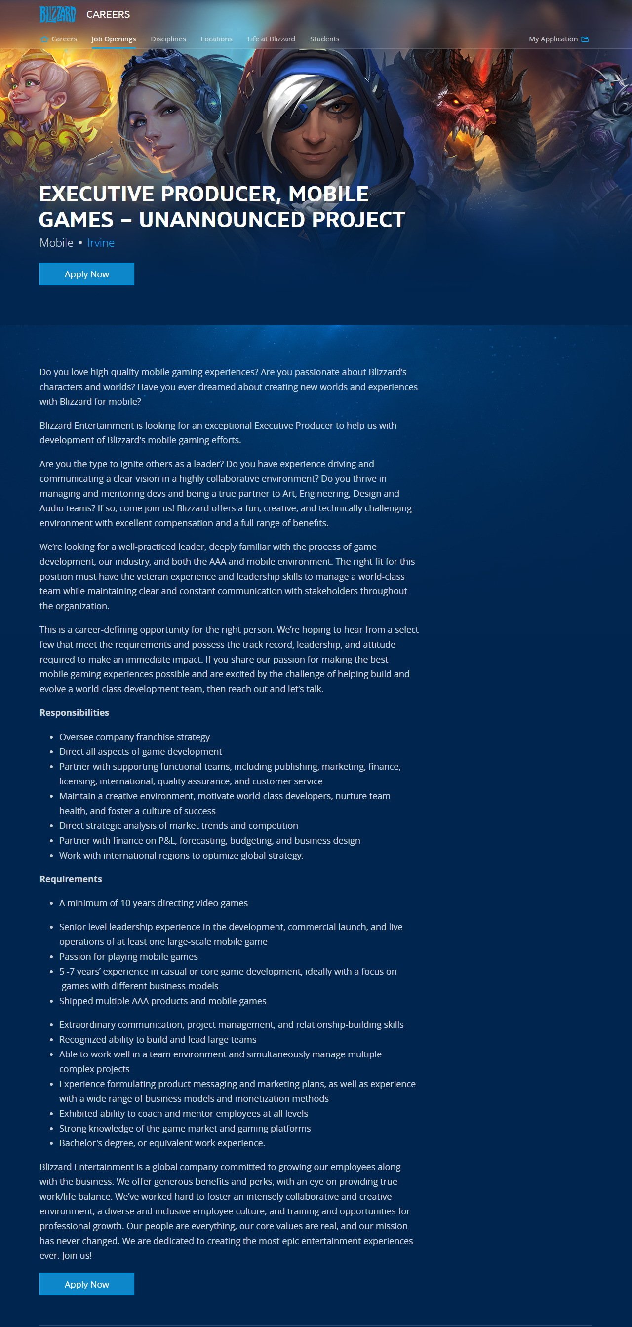 暴雪娛樂稍早於官網釋出多組職缺項目,其中包含徵求尚未公布手機遊戲專案執行製作人,預期協助暴雪娛樂打造更多手機遊戲作品。
