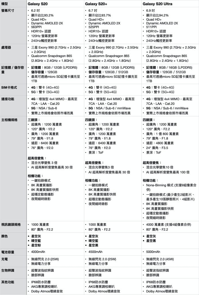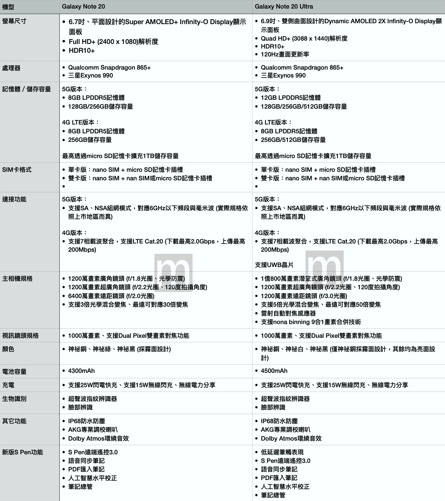 針對此次推出的Galaxy Note 20系列,mashdigi這裡也做了簡易比較表格,藉此對比不同機種規格上的差異。