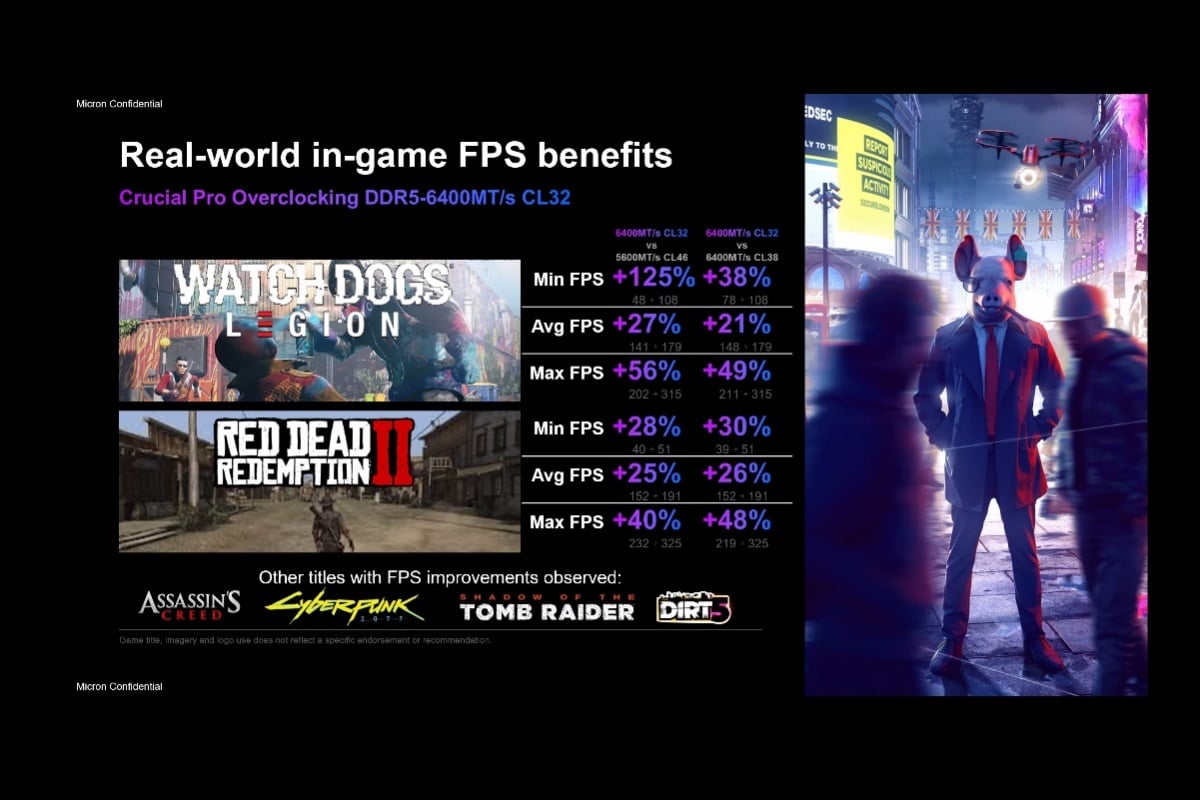 根據官方公布的測試數據,這款記憶體在《看門狗》、《碧血狂殺2》、《電馭叛客2077》、《古墓奇兵:暗影》與《刺客教條》等遊戲中展現顯著的效能提升: