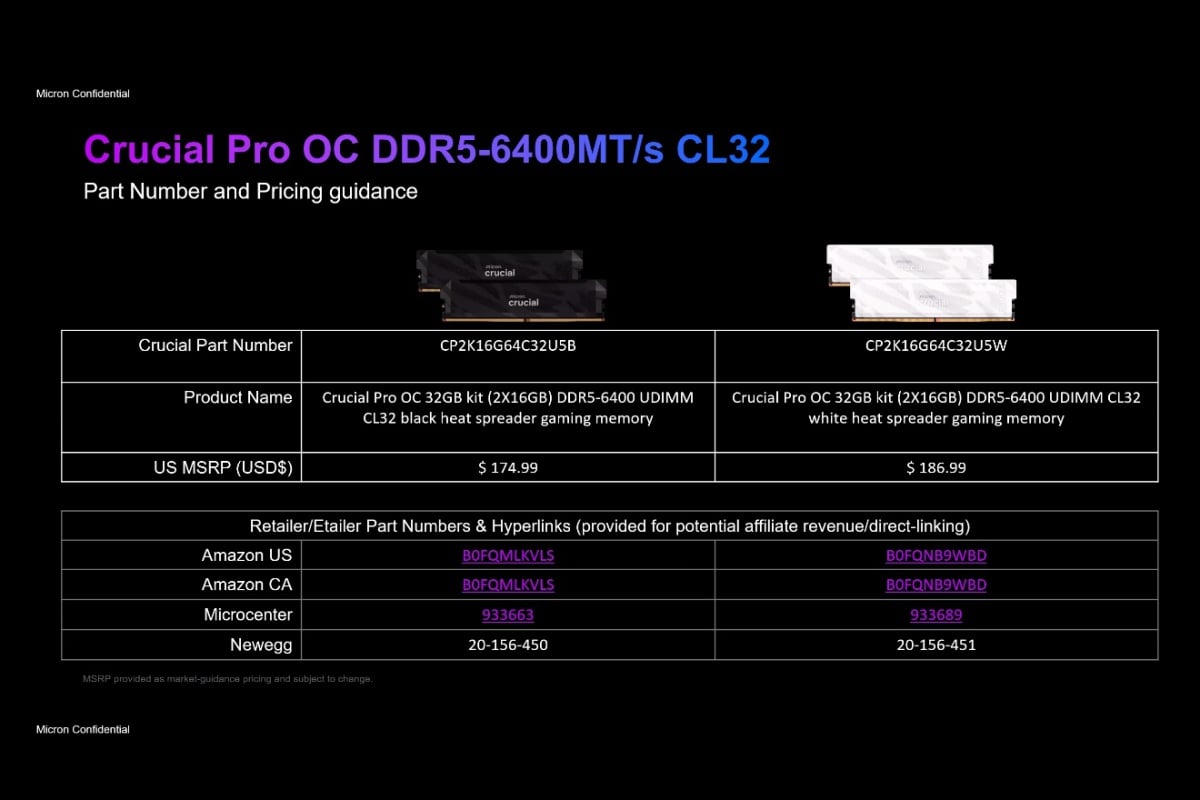 目前Crucial Pro Overclocking DDR5-6400MT/s CL32超頻記憶體產品提供32GB (2x16GB)套裝組合,建議售價為: