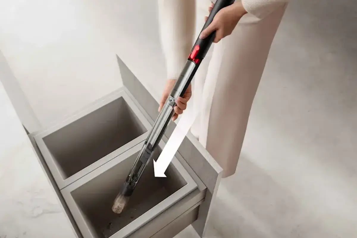 另外,由於集塵系統整合於機身內,本身採空氣壓縮形式蒐集灰塵、碎屑,並且標榜能容納約0.4公升左右的集塵量,同時也讓清潔變得更簡單,僅需將桿身往前推,即可將集塵物推出、傾倒於垃圾桶,而集塵系統一樣可拆解清潔。