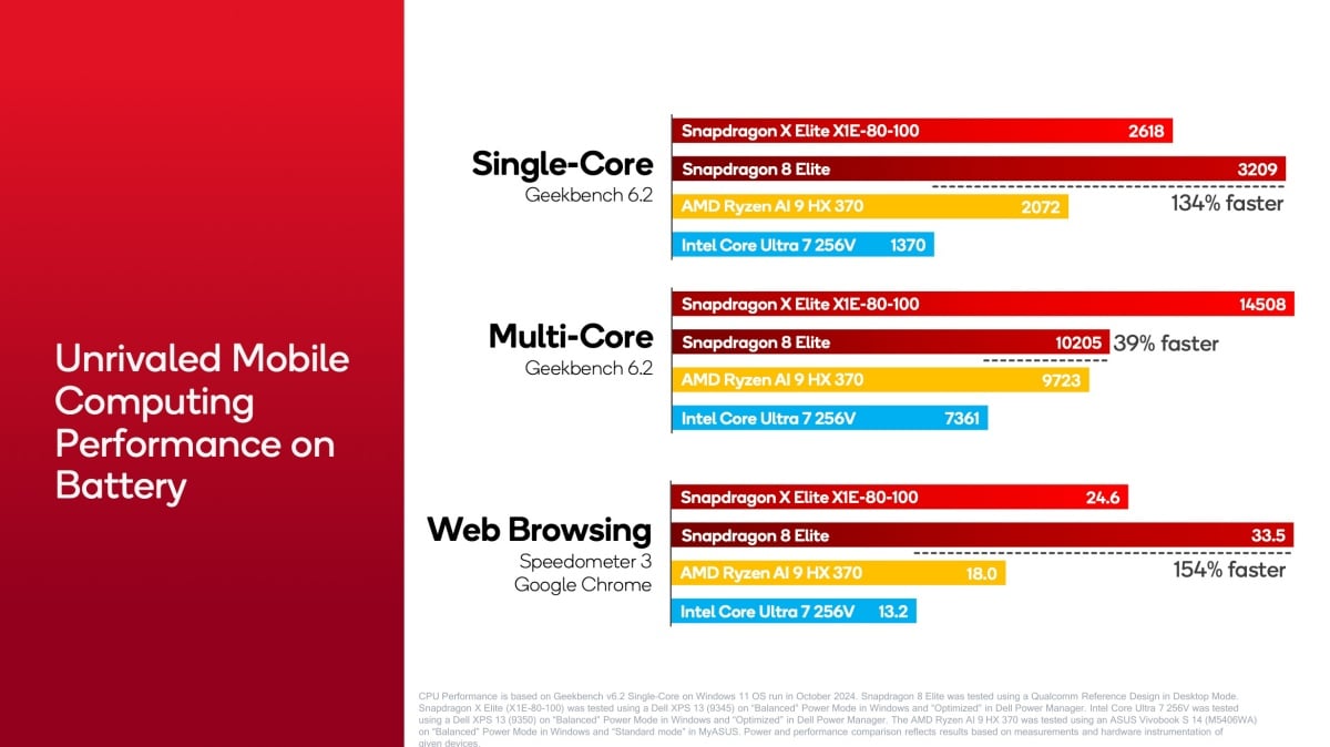在相關測試環節中,Qualcomm實際以筆電品牌業者Dell、三星以相同機型,分別搭載Snapdragon X Elite (X1E-80-100)與Intel的Core Ultra 7 256V處理器情況下進行測試比對。