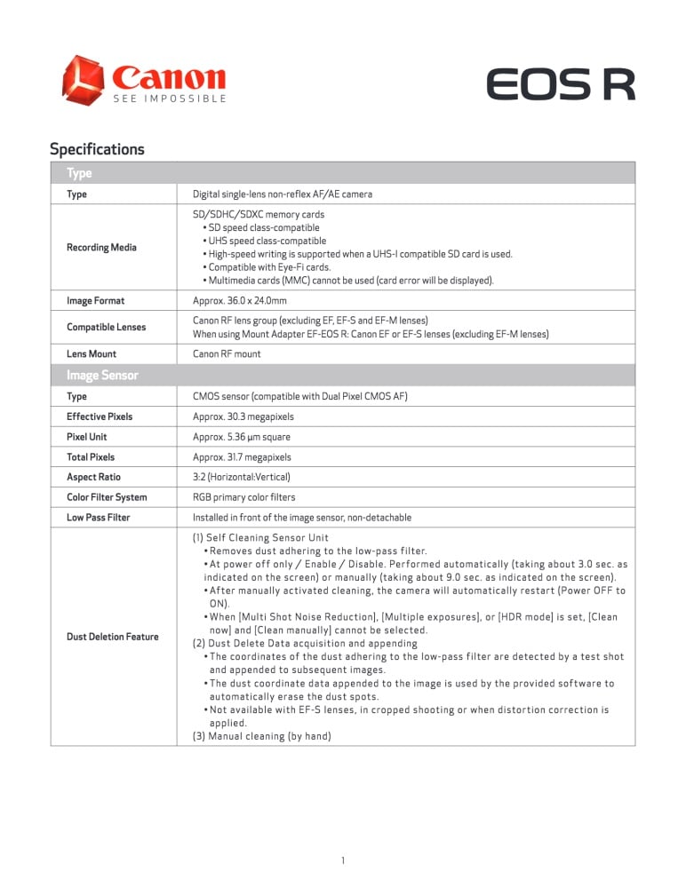 先前已經有不少外觀與預計同步推行鏡頭群消息曝光後,Canon.Watch網站曝光更具體硬體細節,其中包含搭載有效畫素為3030萬,總實際畫素為3170萬畫素的全片幅感光元件,支援拍攝14bit RAW檔案,以及Canon自有C-RAW檔案格式,另外也支援Dual pixel RAW檔案規格,而對焦點總數更達5655組,相比Sony α7 III採用693組對焦點更多,並且支援-6EV值到18EV值的對焦範圍,感光值則支援ISO 100-40000,可擴展至ISO 50-102400。