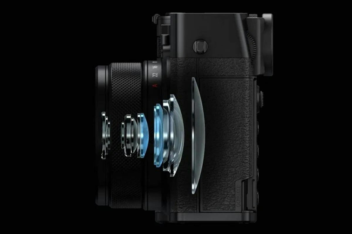 等效28mm f/4光圈設計的沉胴鏡頭系統,其景深表現約等同35mm全片幅機種的f/2.8光圈規格,沉胴鏡頭設計則有效降低原本突出機身比重,最近對焦距離為20公分,並且可透過裁切方式讓原本以定焦拍攝影像分別對應等同45mm、63mm或80mm般的「變焦」效果,另外也搭載GFX系列機種最高的4級ND減光濾鏡。