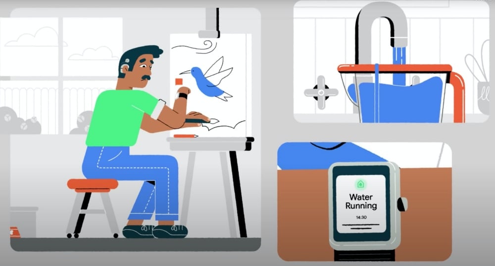 而考量有些人在家會將手機擺放在桌上,或是出門時將手機放在口袋等處,因此這項功能也能與手機配對的WearOS裝置連動,透過聲音、震動等方式提醒使用者有人按門鈴、或是水龍頭沒有關緊等情況。