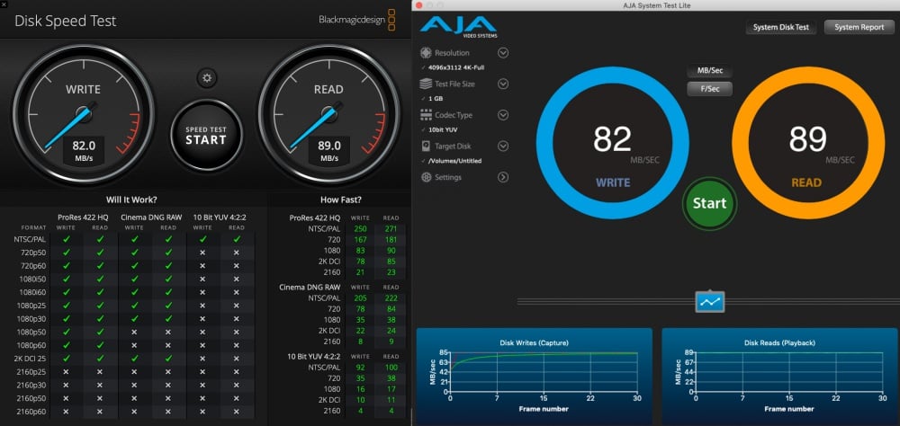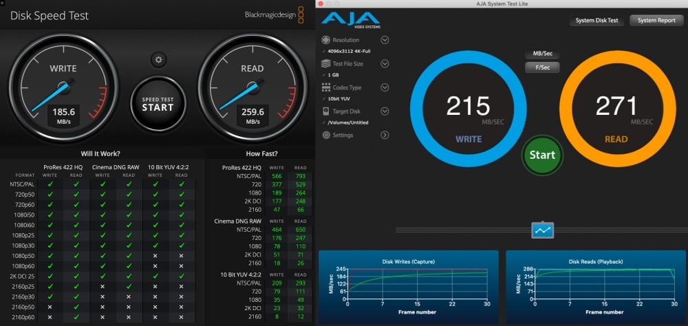 而透過Mac版AJA Video Systems硬碟測試程式,則分別得到每秒215MB寫入與每秒271MB讀取表現結果,在Windows版本所測得數據也幾乎得到相同結果。