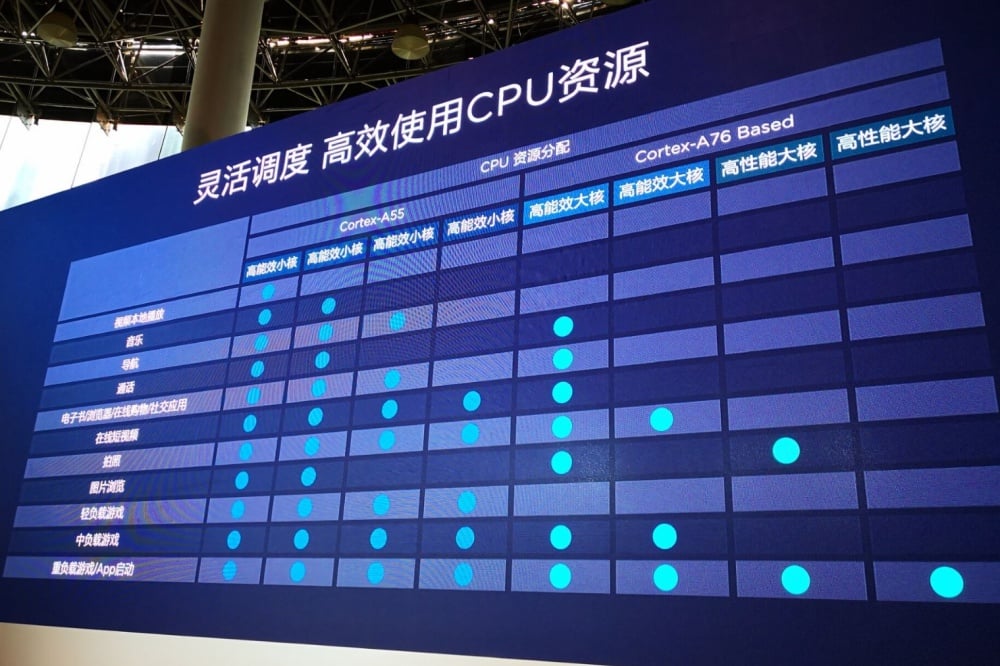 在Kirin 980的設計中,主要透過高運作時脈的兩組大核對應更高運算效能需求,而運作時脈相對較低的第二個兩組大核則是對應主要運算,同時在高時脈運作大核因熱度增加產生限速情況時,第二個兩組大核將會接手運算,避免大核運算效能明顯下降。至於其餘四組小核則主要對應背景運算,或是多工運算需求,藉此以更少耗電完成此類運算工作。
