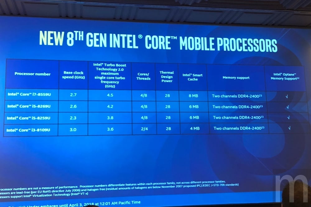 此次更新H系列處理器,主要在筆電產品首度加入Core i9等級、6核心處理器設計,並且導入Intel Tris Plus顯示功能與Optane記憶體技術強化,同時部分規格也加入vPro虛擬化技術,晶片組則將採用300系列設計,分別使用H370、Q370與B360規格,而之後預期也會加入已經針對桌機使用需求推行的Z370晶片組。