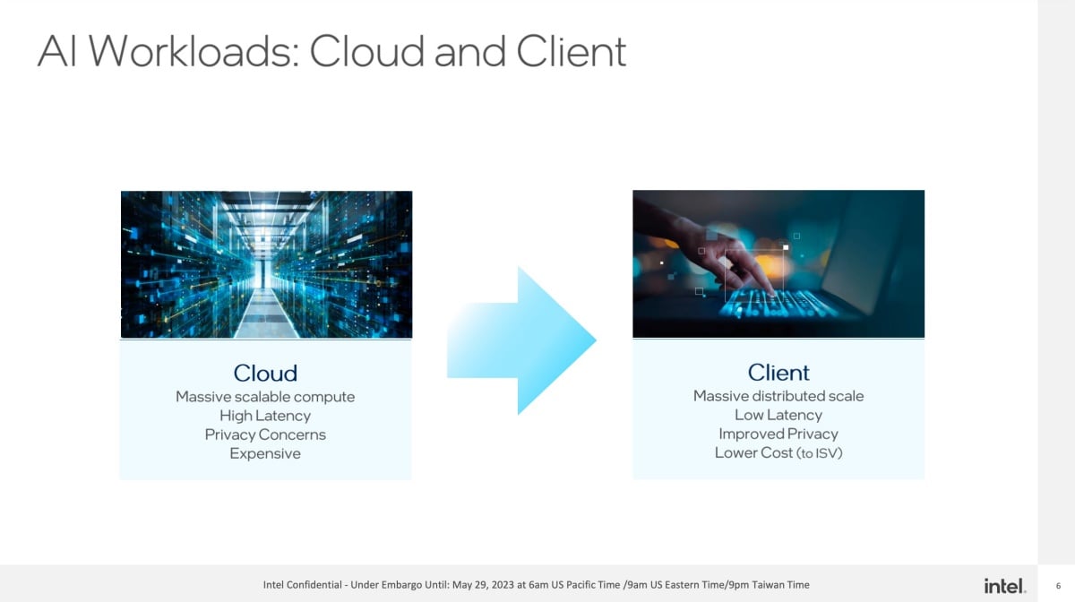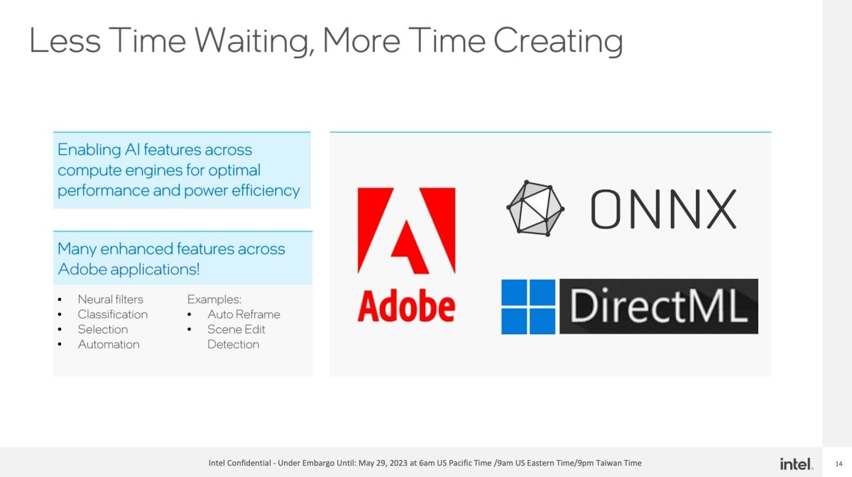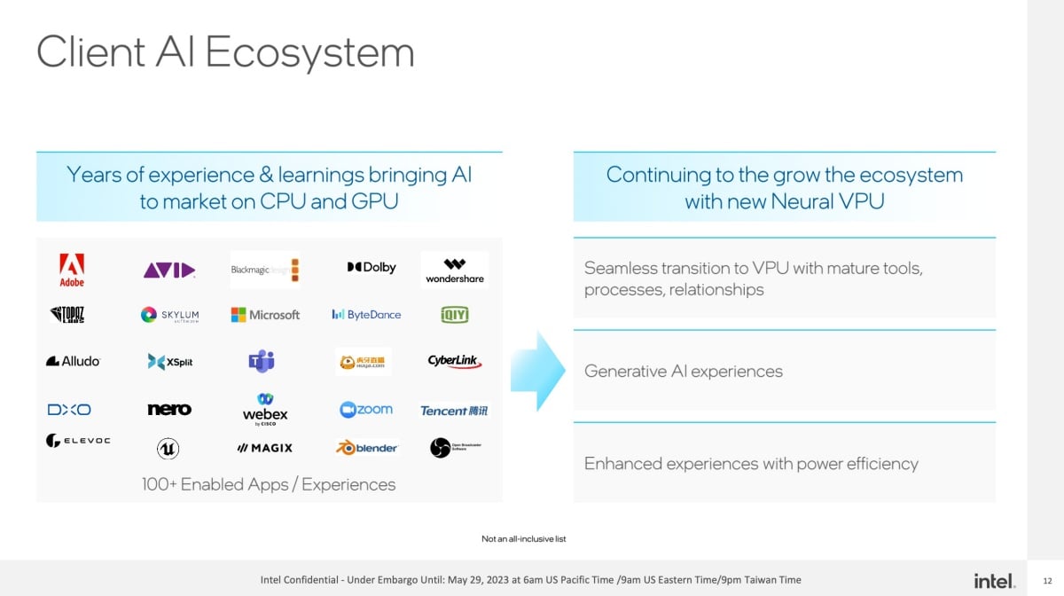 Intel表示,相比過往人工智慧多半是將資料傳送到雲端,在雲端完成運算之後傳回裝置端呈現,此次「Meteor Lake」的設計則是強化裝置端的人工智慧運算效能,不僅能藉由人工智慧提升裝置端運算效能、節電表現,更能結合ONNX、OpenVINO、Web Neural Network API,以及微軟Direct ML等軟體對應各類人工智慧運算技術,甚至本身更可結合眾多第三方軟體、服務推動更大人工智慧運算效益。