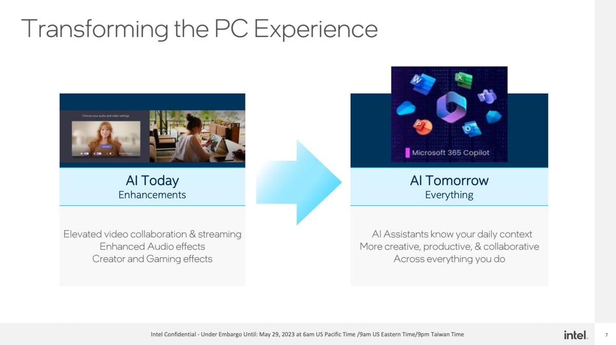 另一方面,Intel更強調所有人工智慧均可在裝置端藉由處理器加速運算,因此不會有資料外洩、隱私受影響問題,而透過人工智慧運算模式也能加速各類軟體、服務執行效率,並且提高電池使用效率。