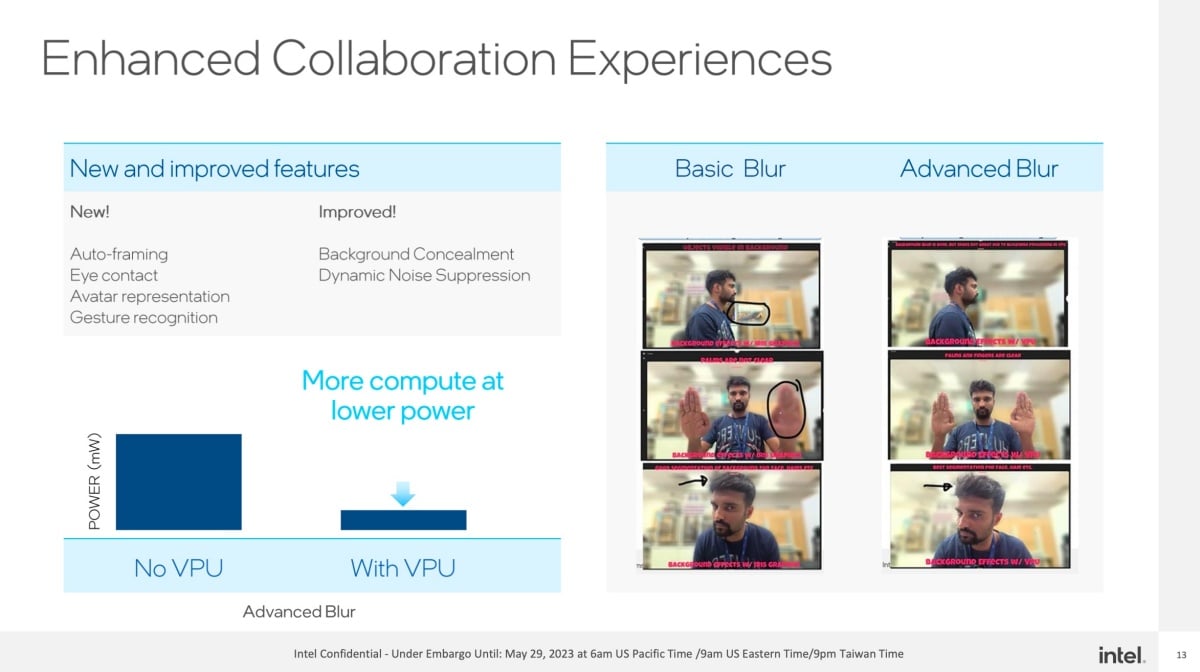 借助人工智慧運算,更能強化裝置端的視訊會議虛擬化背景、將特定內容模糊處理,或是強化人聲收音及消除背景噪音效果,另外也能確保裝置端人智慧運算效果,並且藉由裝置端運算確保個人隱私安全。