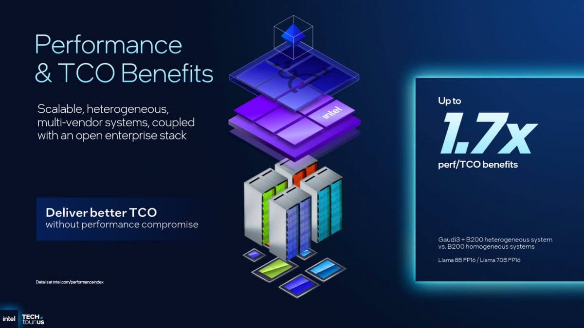 Intel宣稱,這套混合式系統的TCO (總體擁有成本),相比全數使用B200 GPU的系統,能顯著提升1.7倍。