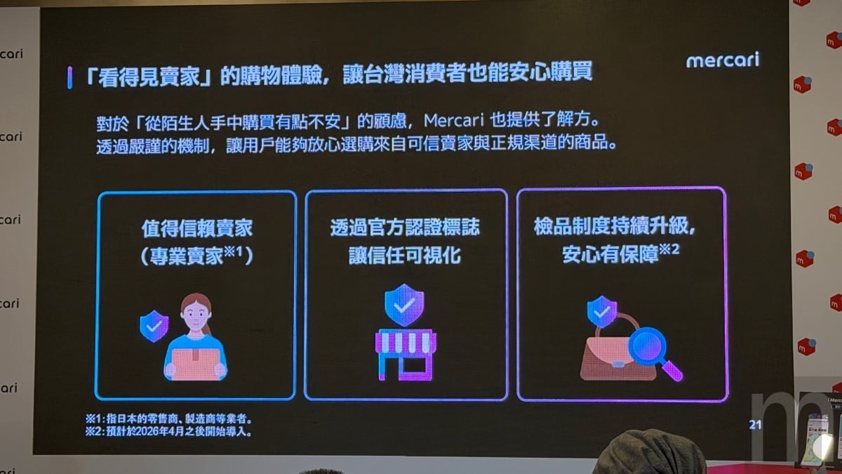 而在強化「安心安全」的核心價值上,Mercari將導入兩大關鍵服務,包含由Mercari官方對所有出貨商品進行細節確認的官方檢品服務,以及針對高單價商品導入的專業鑑定機制。