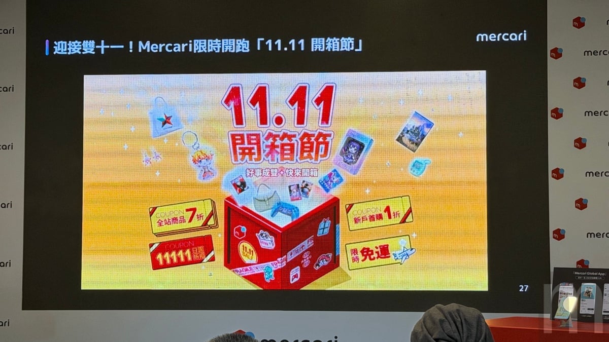 配合全球版App上線,Mercari也同步啟動「11.11開箱節」促銷活動。自10月23日起至11月11日止,將發放全站商品「7折」優惠券 (部分商品除外)。活動期間也將舉辦「開箱祕寶箱」抽獎,每日可挑戰一次,中獎者將獲得價值11111日圓 (約新台幣2300元) 的優惠券,而免運活動則集中在11月9日至11日,天將限時實施全站商品單筆滿5000日圓 (約新台幣1000 元),即享日本至台灣免國際運費的優惠。