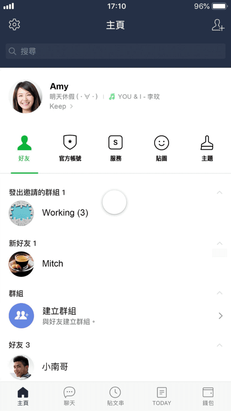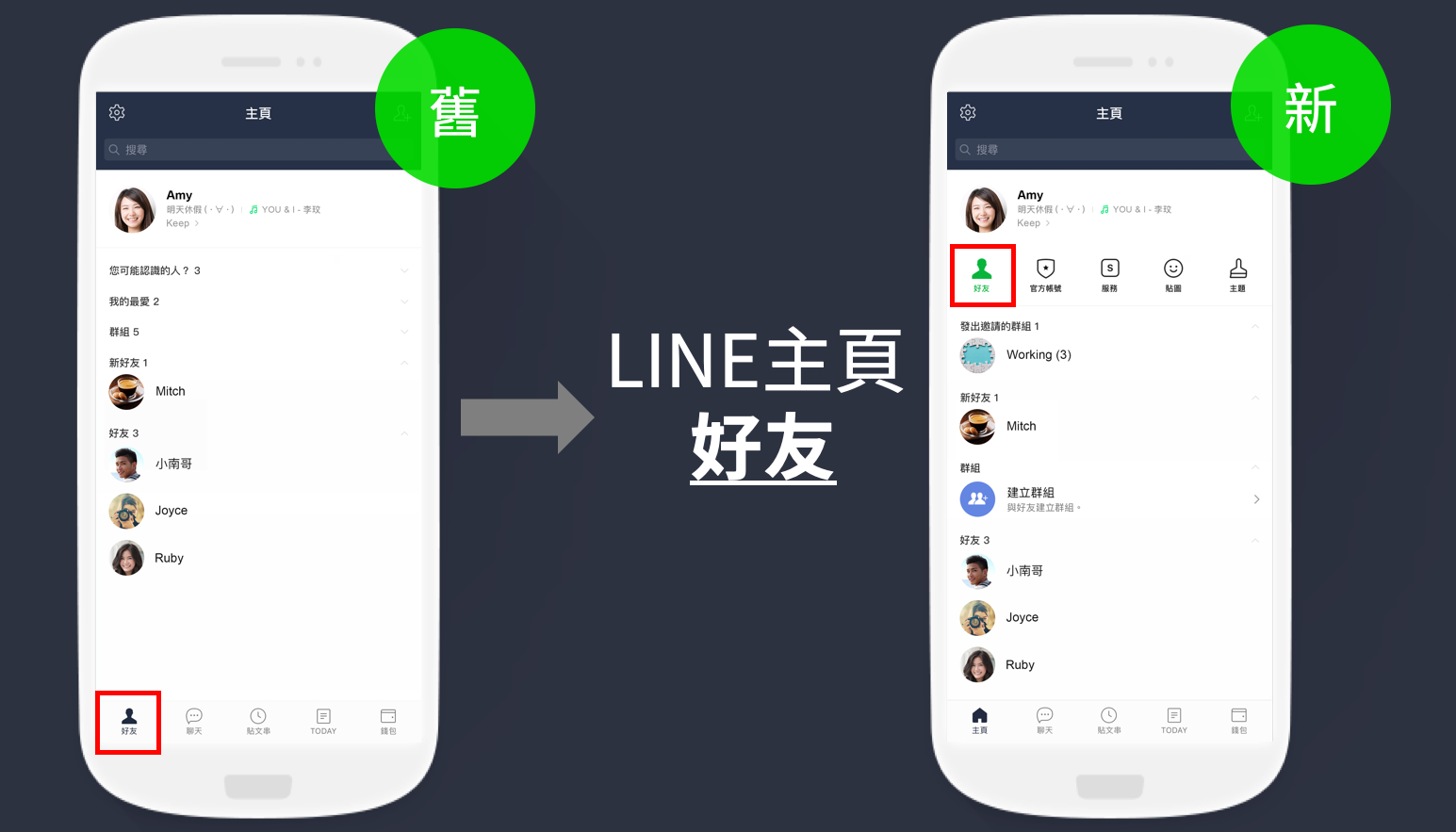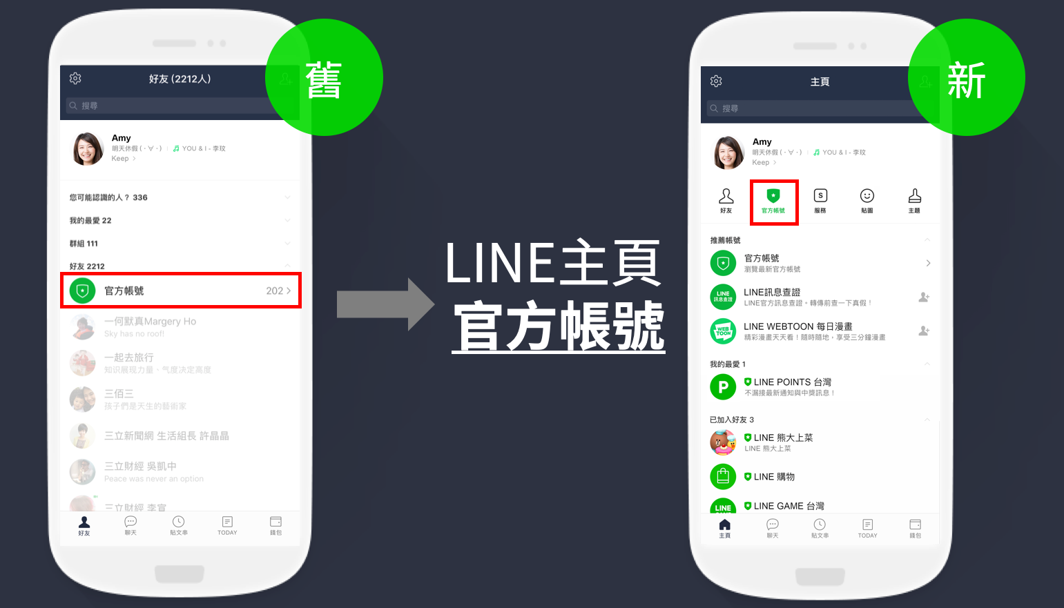 其中,在新的主頁設計將會把「好友」與「官方帳號」分開,讓使用者能更容易區分日常生活中真實互動的親朋好友,並且在「官方帳號好友」中確認各個廠商、服務最新動態,不會像過往全數合併在相同分頁,讓使用者無法直覺找到好友。