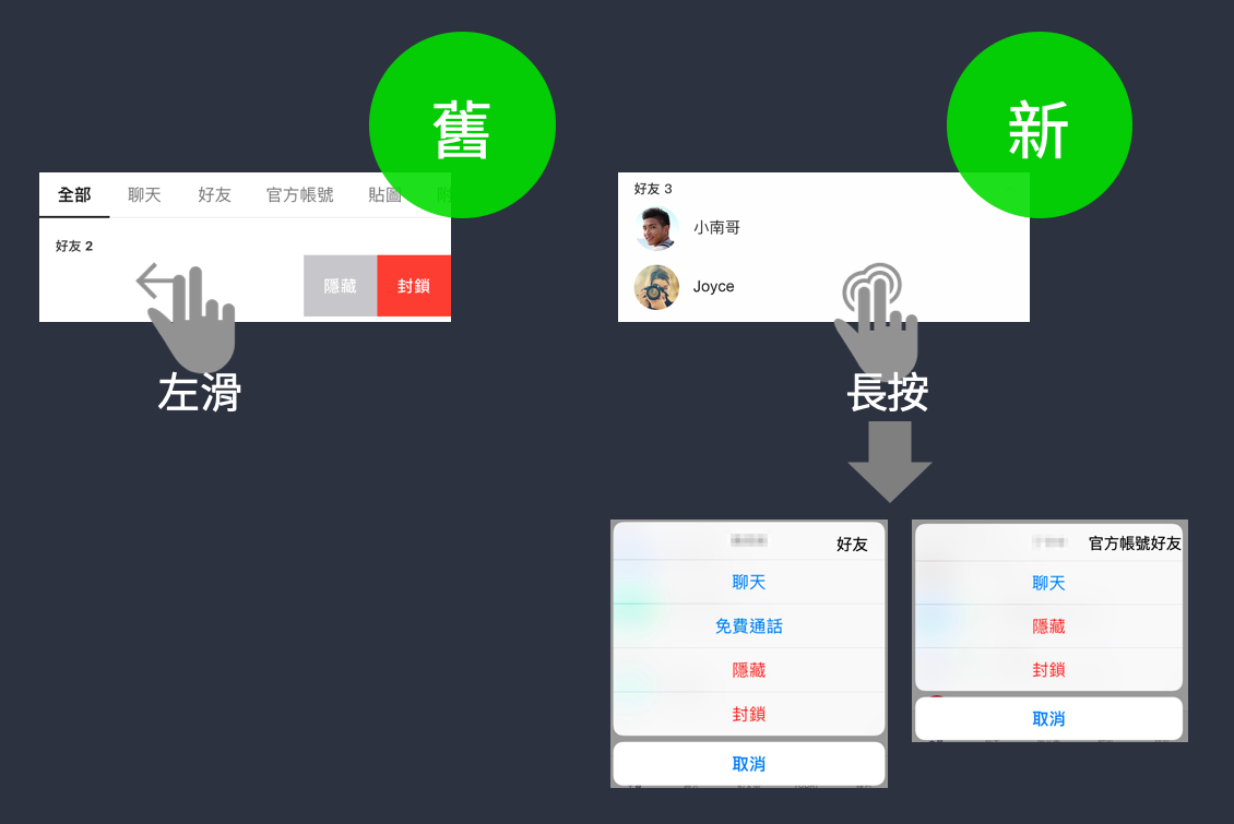 另外,iOS平台版本的操作手勢也計畫調整為與Android平台版本相同,例如原本在好友列表透過左滑顯示「隱藏」或「封鎖」的模式,將會改為長按跳出操作動作選項,藉此讓使用操作更加直覺。