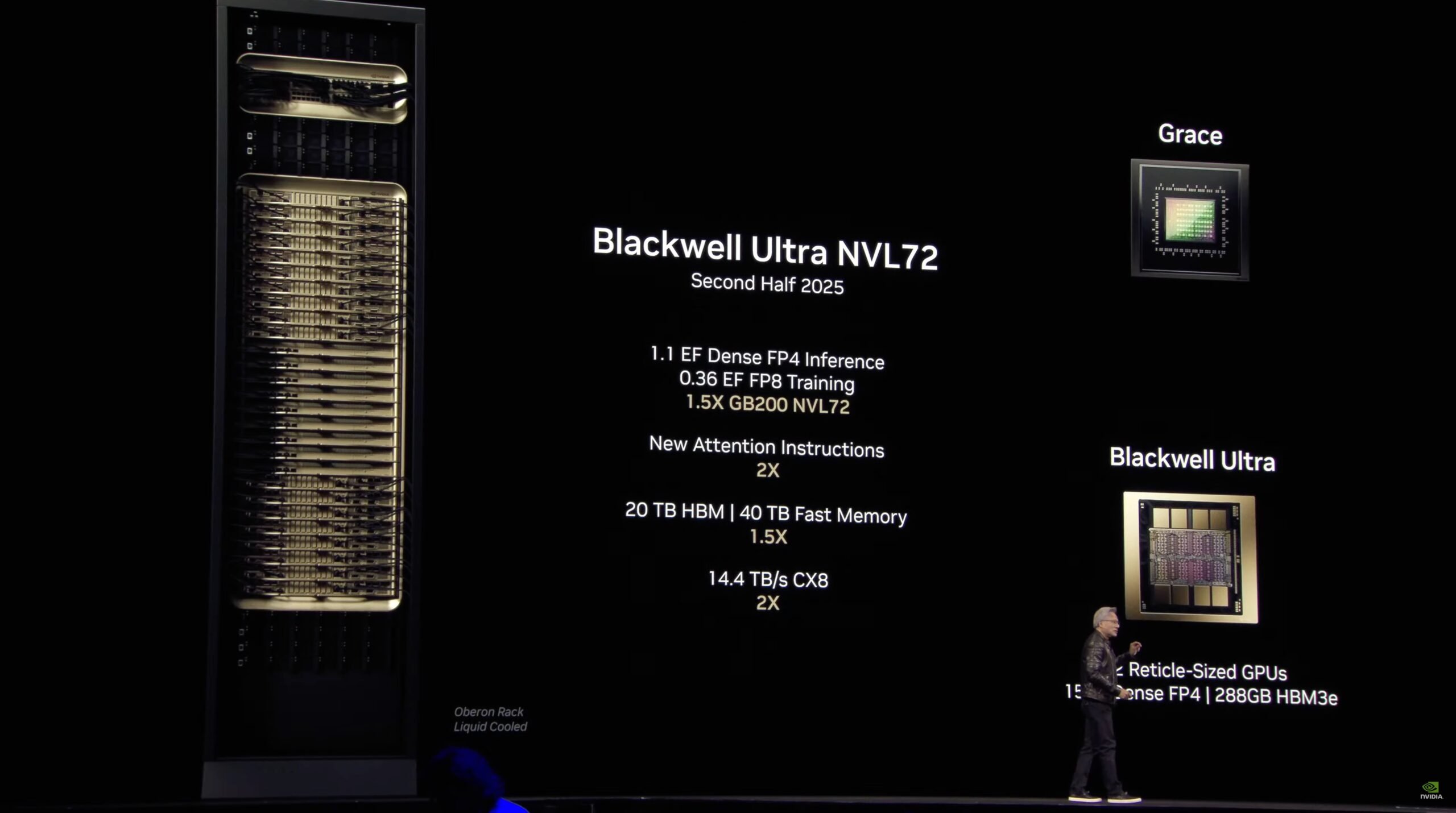 Blackwell Ultra以Blackwell顯示架構為建置基礎,搭載高達288GB容量的HBM3e高頻寬記憶體,並且針對FP4人工智慧運算性能強化,可實現1.5倍的FP4推論能力表現,更可用於NVIDIA GB300 NVL72機架規模解決方案與NVIDIA DGX B300系統。