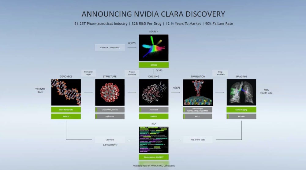 依照NVIDIA說明,目前藥物產業產值約在1.25兆美元,平均每款藥物投資研發成本為20億美元,並且平均花費12.5年才能順利進入市場使用,同時在研發過程也有高達90%的失敗率。