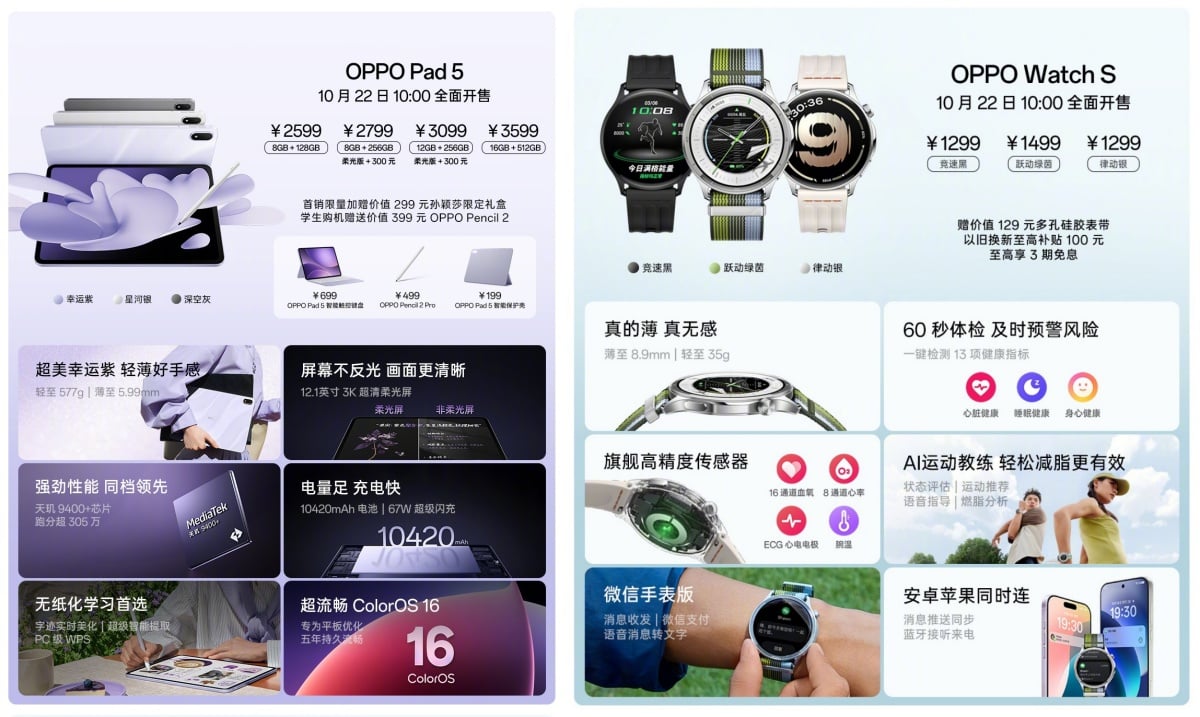 除了Find X9系列,OPPO也同步推出搭載12.1吋螢幕、天璣9400+處理器、10420mAh電池容量,同樣搭載ColorOS 26操作介面的OPPO Pad 5,另外也推出厚度僅8.9mm、僅有35公克重,並且標榜能對應Android、iOS裝置使用的OPPO Watch S智慧手錶。