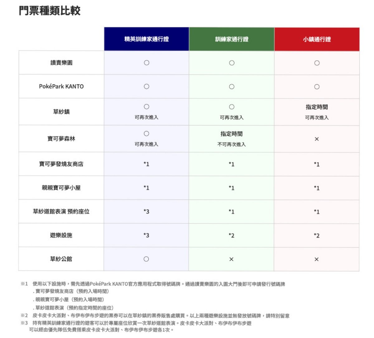 • 權益: 無需指定時間即可進入寶可夢森林與草紗鎮 。並享有特別迎賓會、道館表演預約座位、遊樂設施優先隊伍、獨家禮品等特典 。