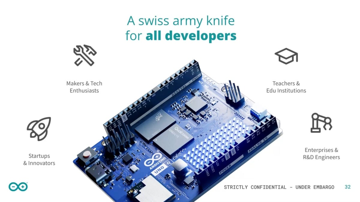 為了呼應這次收購,Qualcomm與Arduino於義大利舉辦發表會,並且宣布推出全新開發板UNO Q。這是首款搭載Qualcomm Dragonwing QRB2210的「雙腦」 (dual-brain)設計開發板,能同時結合高效能的Linux運算,並且以即時微控制器精準操控表現。