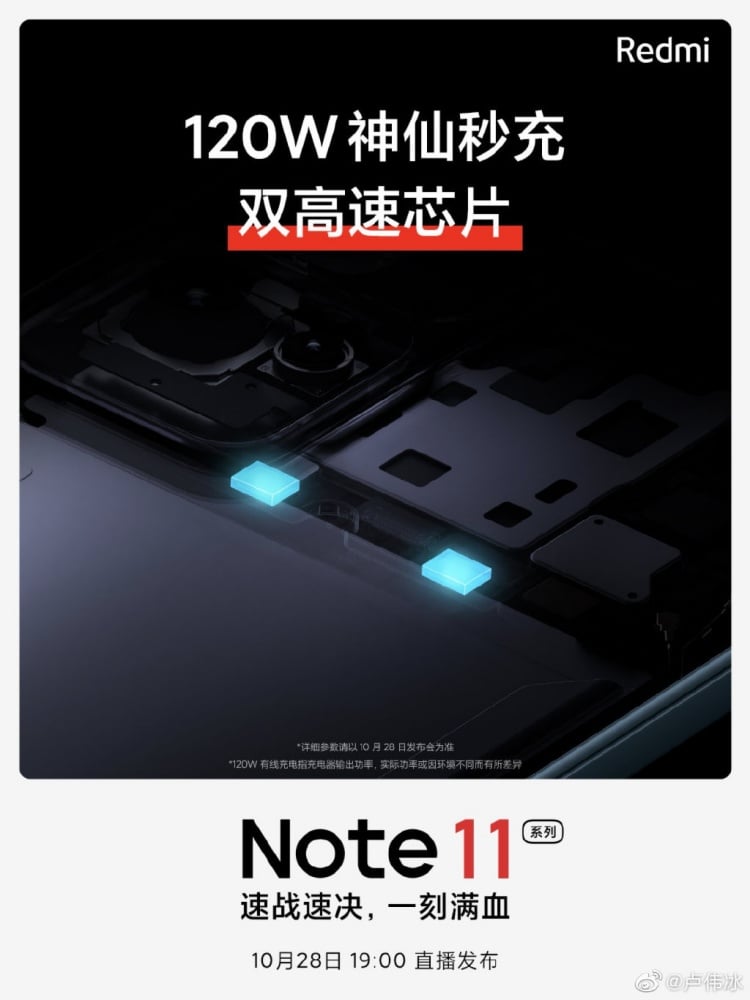 日前確定將在10月28日晚間7點揭曉新款Redmi Note 11系列手機消息後,Redmi品牌總經理盧偉冰證實此系列手機將加入更進階的120W有線快充。