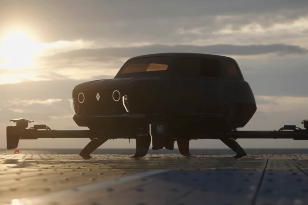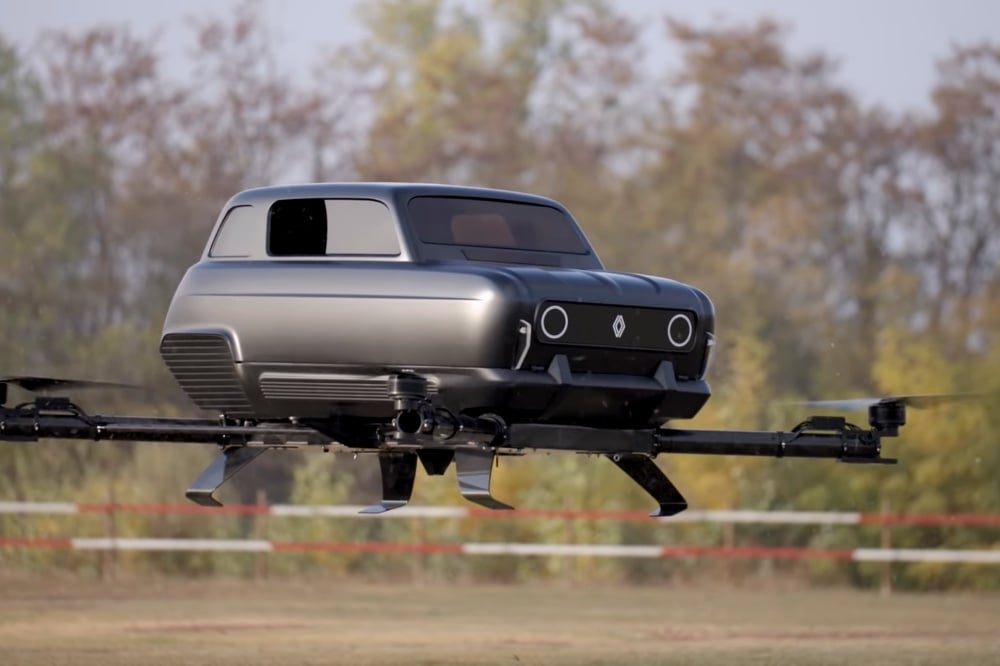 這台概念飛天汽車是由雷諾與邁阿密設計公司 TheArsenale合作打造,其中將Renault 4外型車身放在四組旋翼構成的大型機台上,並且透過碳纖維材質減輕整體重量,並且以多組容量為22000mAh的鋰聚電池,構成總容量達90000mAh的電池組作為動力來源,讓每組旋翼可產生95公斤的上升推力,藉此生成總計達380公斤的上升推力,同時每秒可爬升14公尺。