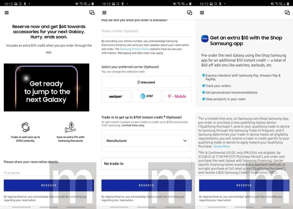 不過,若消費者點按預約,並且留下電子郵件等資訊,即可獲得60美元新機配件購買折價金,甚至也針對Samsung Shop App使用者額外提供10美元折價金。此外,消費者也能選擇以舊換新、最高折抵700美元價格方案購機,以及透過Samsung Pay、Amazon Pay或PayPal等方式支付購機費用。