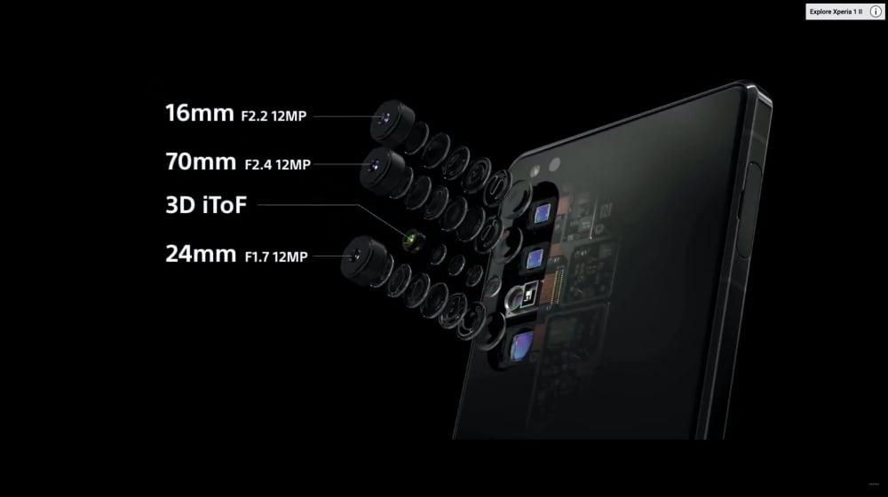 此次在Xperia 1 II的鏡頭部分,視訊鏡頭部分依然維持800萬畫素規格,背面主相機則分別配置16mm等效焦距、f/2.6光圈、支援雙相位對焦的1200萬畫素超廣角鏡頭,以及24mm等效焦距、f/1.7光圈、同樣支援雙相位對焦,並且支援光學防震的1200萬畫素廣角鏡頭,另外則是搭配70mm等效焦距、f/3.4光圈、支援相位對焦與光學防震的1200萬畫素人像鏡頭 (對應2倍光學變焦)。