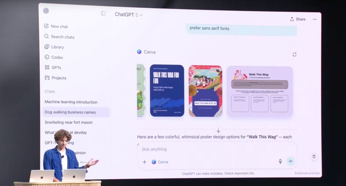 另一個展示則來自Canva,例如可在ChatGPT中與AI討論創業構想,最後直接透過Canva生成「寵物遛狗服務」的宣傳海報。這項整合讓ChatGPT不僅能協助構思內容,還能將創意轉化為實際設計成果,意味對話式AI開始真正進入「可行動」階段。