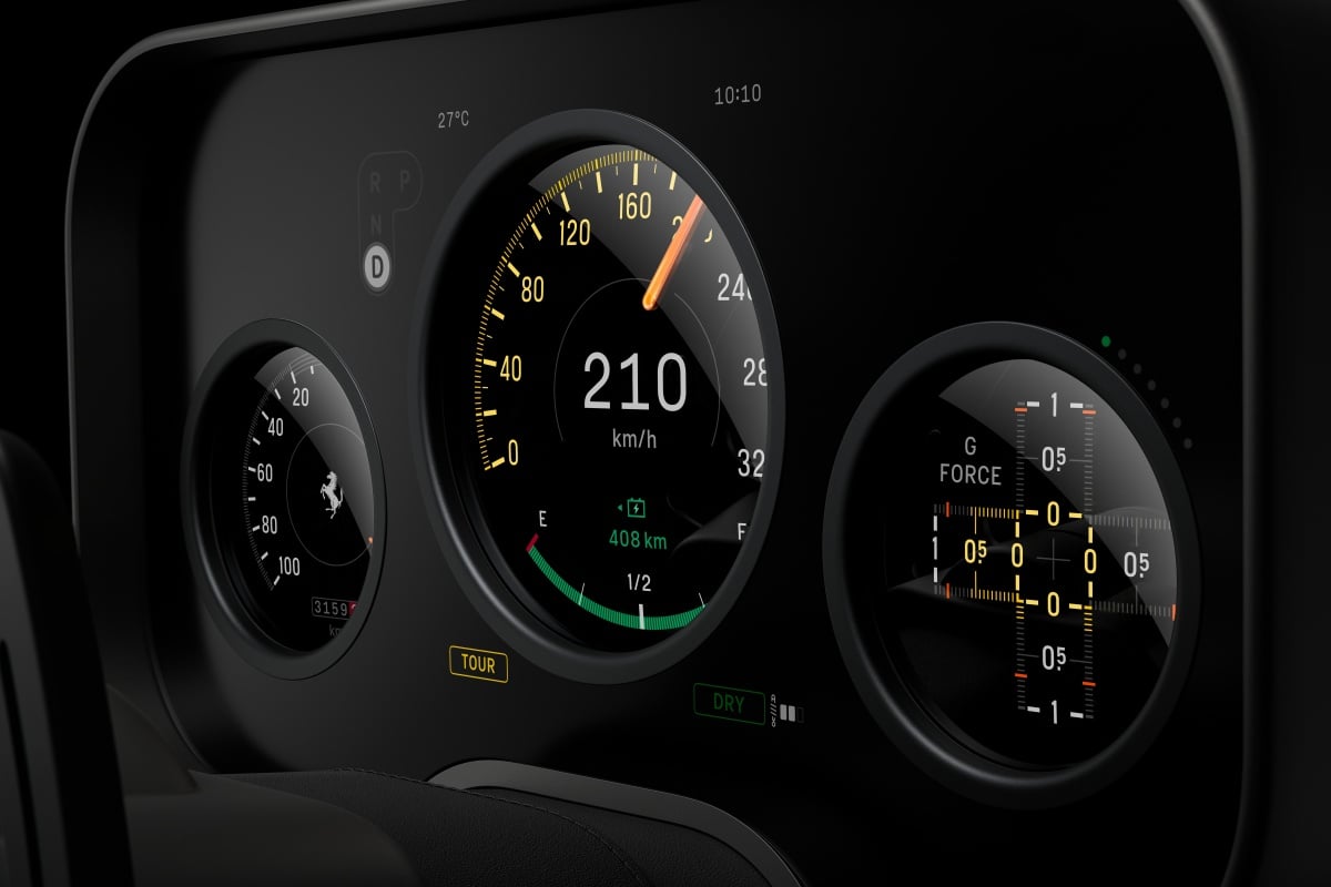 • 機械與數位的融合:儀表板由兩塊堆疊的三星OLED顯示面板組成,中間卻夾著一根實體的指針,作為這台無引擎跑車的「偽轉速表」。
