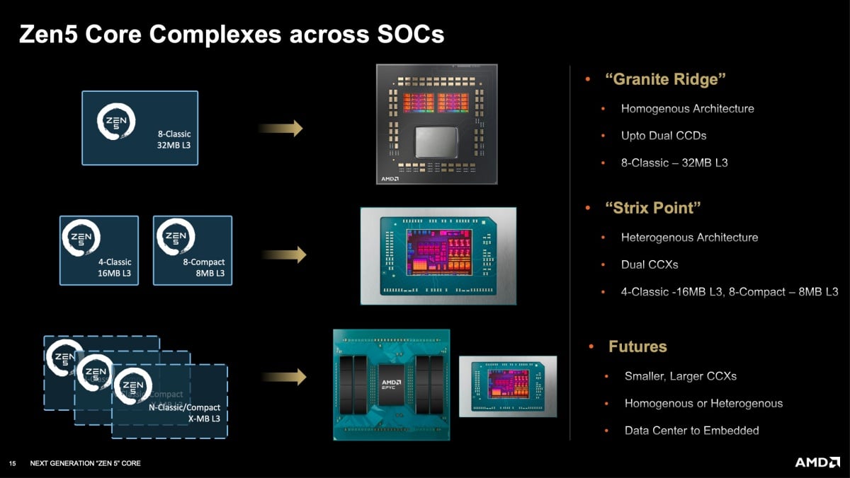 之後推出產品,則將藉由Zen 5架構可擴充設計,可對應更小或更大的CCX設計配置,同時也能對應均質或異質架構,更可對應資料中心級別處理器或嵌入式處理器設計需求。