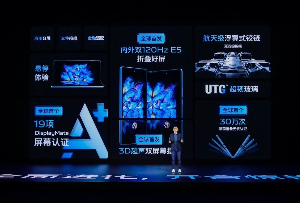 硬體規格方面,X Fold採用Qualcomm Snapdragon 8 Gen 1,並且配置12GB LPDDR5記憶體,以及256GB或512GB的UFS 3.1儲存容量,其他還額外配置硬體等級的資料安全防護,以及獨立CS43131 Hi-Fi音訊晶片,另外則配置三組麥克風與更大音腔設計的雙喇叭設計,電池容量則是4600mAh,對應66W有線快充與50W無線快充,同時提供10W無線反向充電功能。