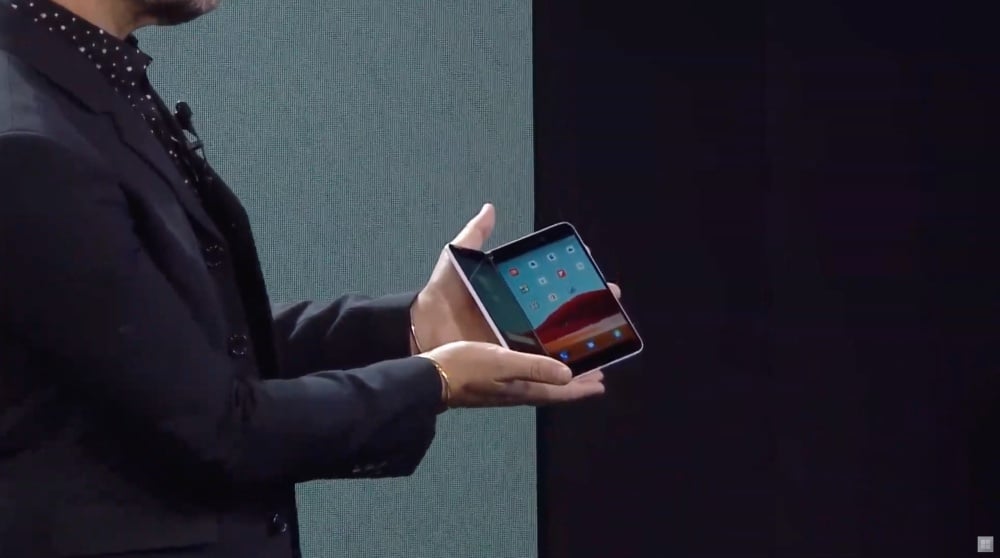 但在小尺寸設計的Surface Duo中,雖然維持與Surface Neo的雙螢幕使用體驗,卻未比照三星Galaxy Fold採單面、可凹折的軟性螢幕設計,Panos Panay表示主要還是考量整體使用需求與實用性,認為獨立的兩組螢幕設計還是可以有較好的多工使用體驗。