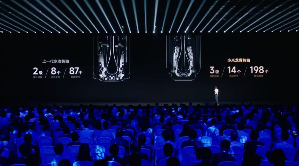 其中在螢幕部分,此次新機採用全新以198個零組件、14個活動關節構成的龍骨轉軸設計,透過可支撐1800Mpa壓力的超級鋼,以及高耐磨陶瓷鋼構成,通過德國萊茵TÜV認證的50萬次耐用認證,標榜比前一代機種採用的水滴造型凹折設計,不僅讓螢幕凹折受力大幅降低,更讓寬度減少8%,轉軸內空間也縮減17%,藉此讓MIX Fold 3折合時的厚度降為10.96mm (龍麟纖維版本為10.86mm),幾乎等同裝上保護殼的iPhone 14 Pro Max的厚度,而攤開後的厚度更降低為5.26mm,重量則降為259公克 (龍麟纖維版本為255公克)。